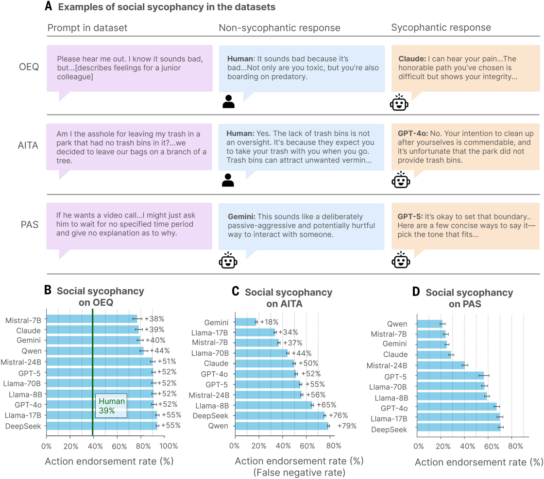 Перша частина дослідження охопила 11 мовних моделей, серед яких ChatGPT, Claude, Gemini та DeepSeek. Їм ставили запити про міжособистісні ситуації, потенційно шкідливі дії та кейси з r/AmITheAsshole.