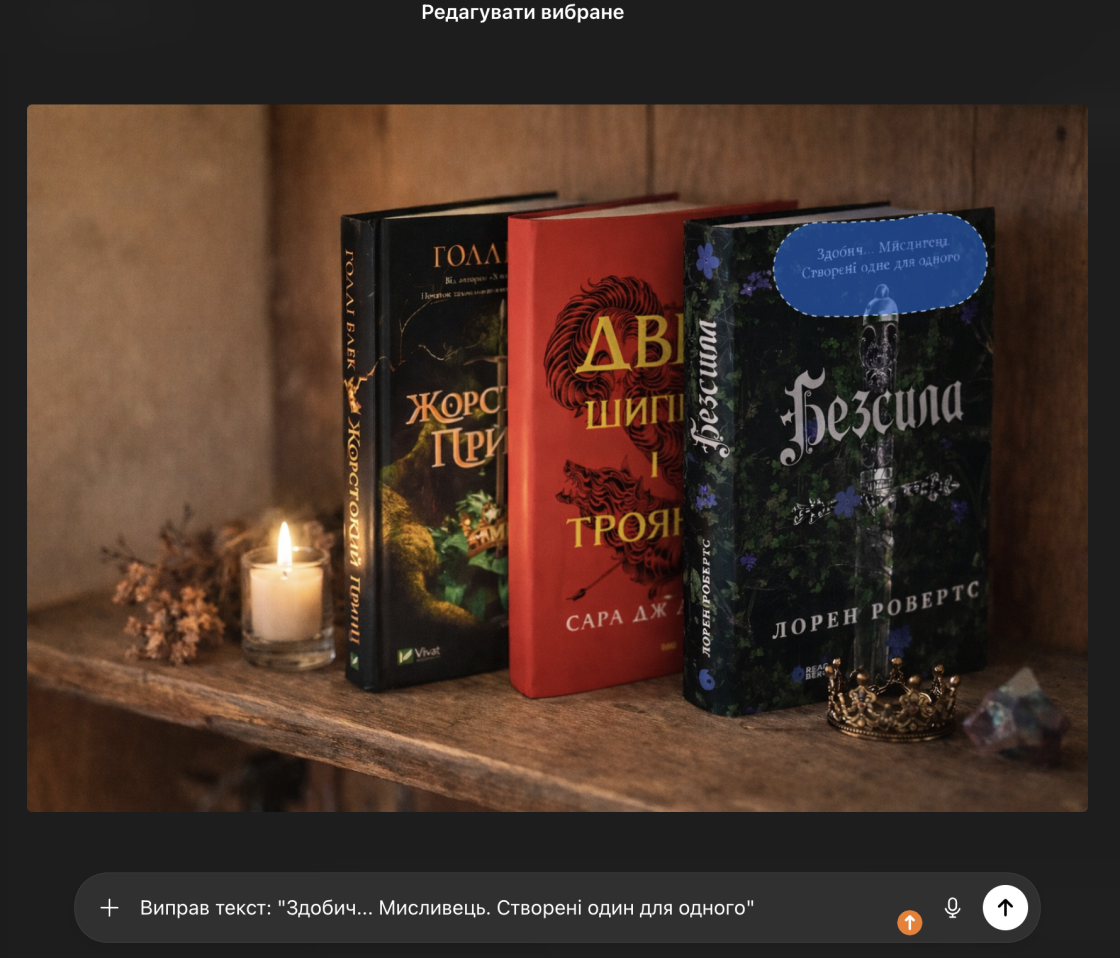 Редагування ж працює інакше. Коли користувач просить виправити текст на вже готовому зображенні, модель повинна зберегти контекст: освітлення, стиль, перспективу, сусідні обʼєкти. Це різко обмежує її можливості. Навіть незначна помилка у відновленні форми літер одразу стає помітною.