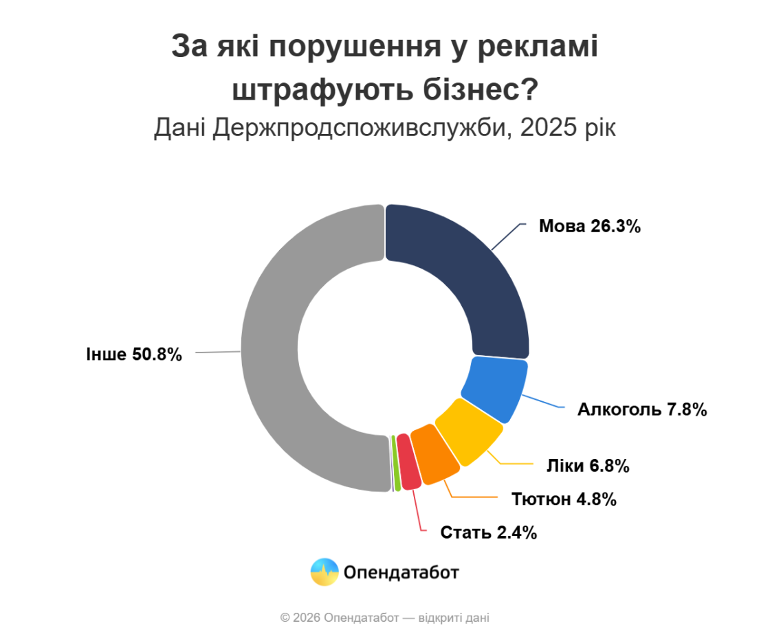 Найпоширенішим порушенням стало використання недержавної мови в рекламі — 1 075 випадків, або 26,3% від загальної кількості. Понад половину таких порушень зафіксували у Харківській області — 672 випадки. Серед інших частих причин штрафів — реклама алкоголю (320), лікарських засобів (276) та тютюнових виробів (195).