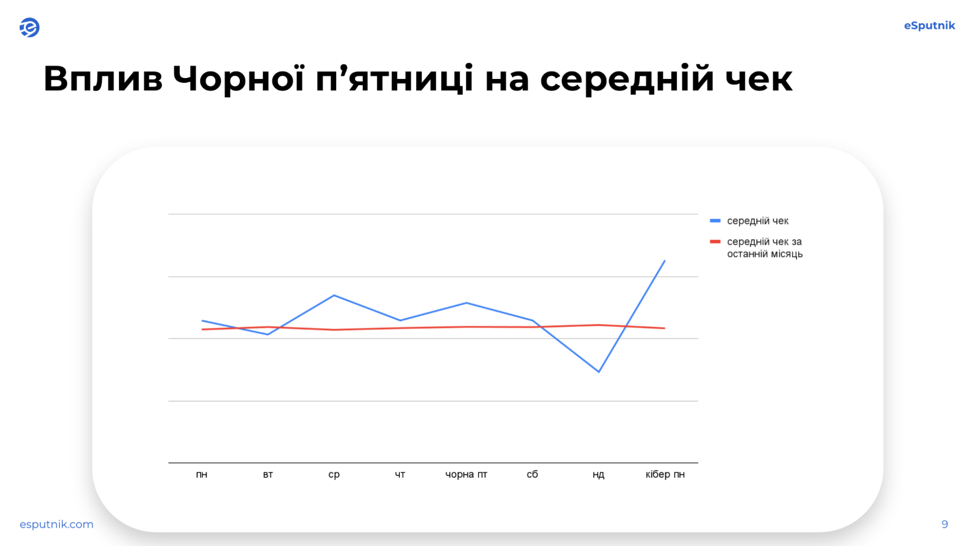 За даними eSputnik, середній чек не демонструє різкого зростання у тиждень Чорної п’ятниці. Покупці активніше купують, але витрачають обережніше. Порівняно з середнім показником місяця, динаміка залишається стабільною — без значного підйому навіть у пікові дні розпродажів.