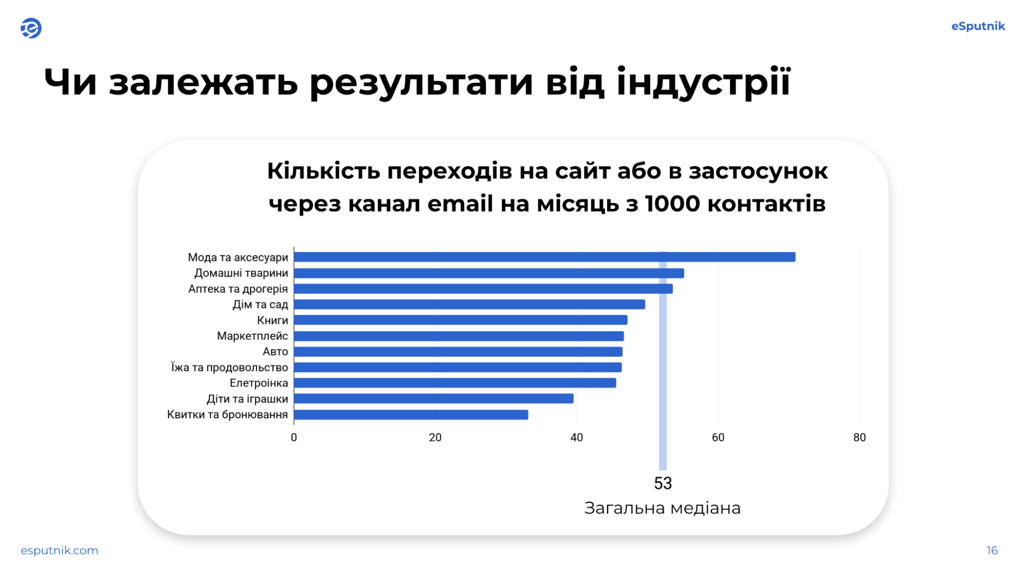Нижчі показники спостерігаються у категоріях електроніки, дитячих товарів та бронювання квитків — аудиторія тут менш схильна реагувати на email-розсилки, а рішення про покупку часто приймаються після додаткового пошуку або консультації.