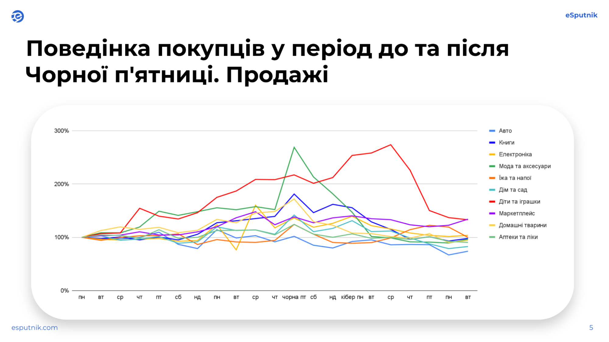 - попит на дитячі товари зростає поступово протягом усього тижня розпродажів і досягає піка після Чорної пʼятниці — перед сезонними святами;