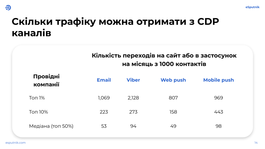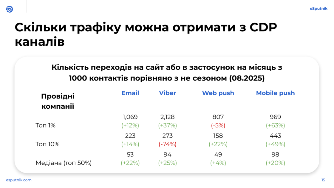 Під час сезону розпродажів бізнес може суттєво збільшити обсяги переходів на сайт або в застосунок, використовуючи персоналізовані канали комунікації — email, Viber, web push і mobile push. За даними eSputnik, навіть за бази в 1 000 контактів можна отримати від десятків до тисяч переходів, якщо кампанії побудовані на даних і точному таргетингу.