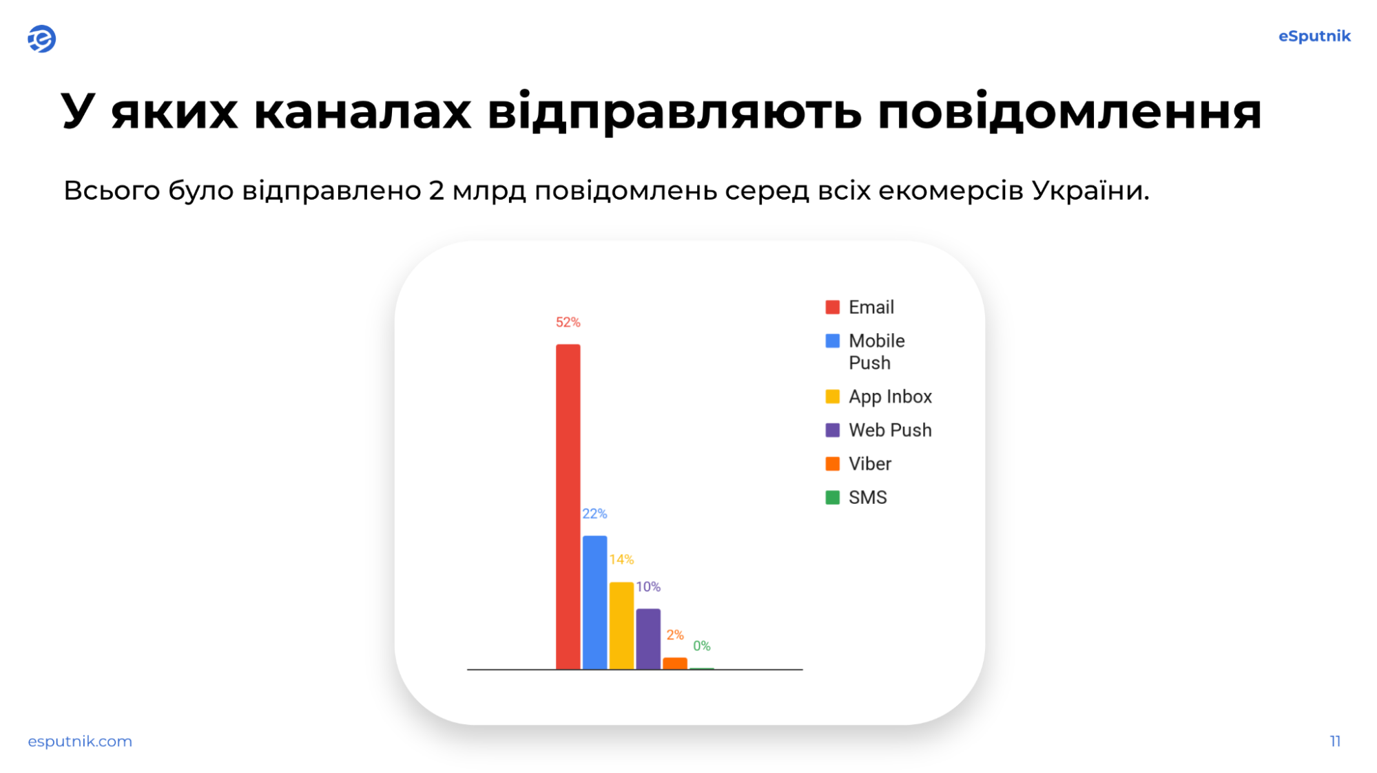 У 2025 році українські ecommerce-компанії надіслали понад 2 мільярди маркетингових повідомлень, найбільше з яких — через email (52%). Це залишається базовим каналом завдяки низькій вартості та широкому охопленню.