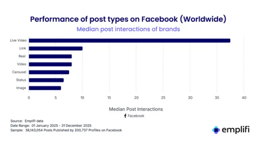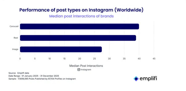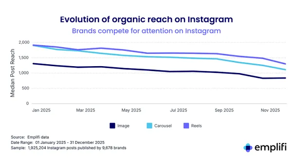 Водночас в Instagram органічне охоплення зменшується для всіх типів контенту. Emplifi зазначає, що Instagram демонструє стабільне, але помірне зростання підписників, а Facebook залишається майже без змін. Обидві платформи зберігають роль базових каналів охоплення, але не виступають драйверами швидкого масштабування авдиторії.