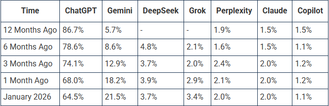 Нові дані аналітичної компанії SimilarWeb свідчать про зміну балансу сил на ринку ШІ-інструментів у вебі. Частка ChatGPT у січні 2026 року знизилася до 64,5%, тоді як ще у січні 2025-го вона становила близько 86%.
