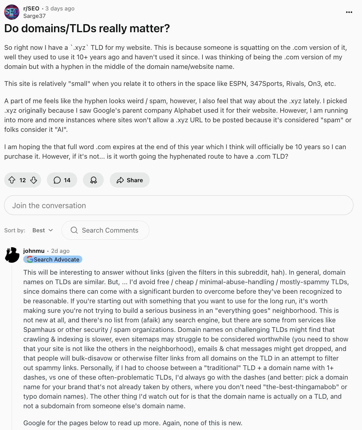 Представник Google Джон Мюллер у дискусії на Reddit заявив, що обирав би традиційні доменні зони (.com, .org, .net), навіть якщо назва вже зайнята і доведеться використати дефіс. За його словами, це краще, ніж працювати з дешевими або проблемними TLD, які часто пов’язують зі спамом.