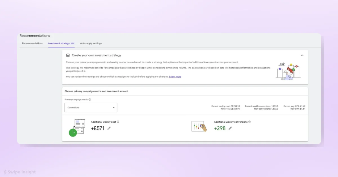 Паралельно Google запустила вкладку Investment Strategy у розділі Recommendations. Вона показує, як збільшення бюджету вплине на показники кампаній — кліки, конверсії та їхню вартість.