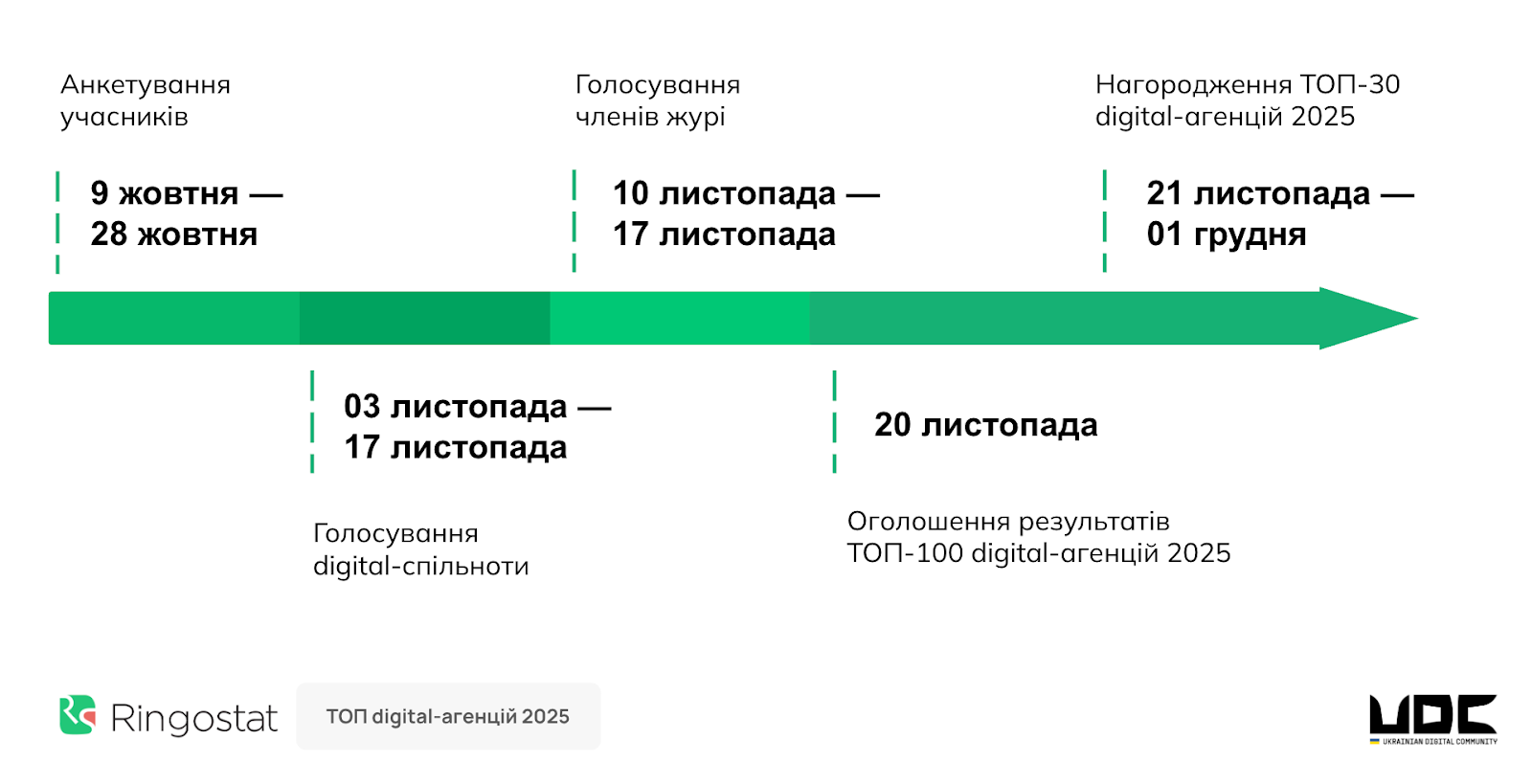 Ringostat спільно з Ukrainian Digital Community запустили рейтинг digital-агенцій України 2025. Мета — показати реальний стан українського digital-ринку та відзначити агенції, які надають комплексні послуги з просування бізнесу в диджиталі.