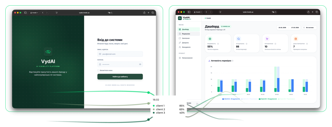«Конкуренція за трафік та позиції в пошукових системах поступово доповнюється конкуренцією за присутність у відповідях ШІ. Бізнеси вже стикаються з ситуацією, коли клієнт формує уявлення про компанію ще до першого переходу на сайт. VYDAI дозволяє побачити й виміряти цей ефект, щоб мати змогу впливати на результат» — Владислав Наумов, Chief Operating Officer (COO) в Inweb та розробник сервісу