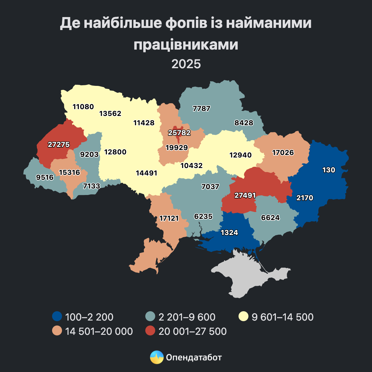 Найбільше ФОПів-роботодавців зареєстровано у Дніпропетровській області — 27,5 тисячі. Далі йдуть Львівська область (27,3 тисячі) та Київ (25,8 тисячі).