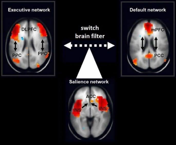 - мережа виразності: допомагає перемикатися між двома іншими мережами. Також виконує фільтруючу функцію — визначає, що потрапляє у свідомість.