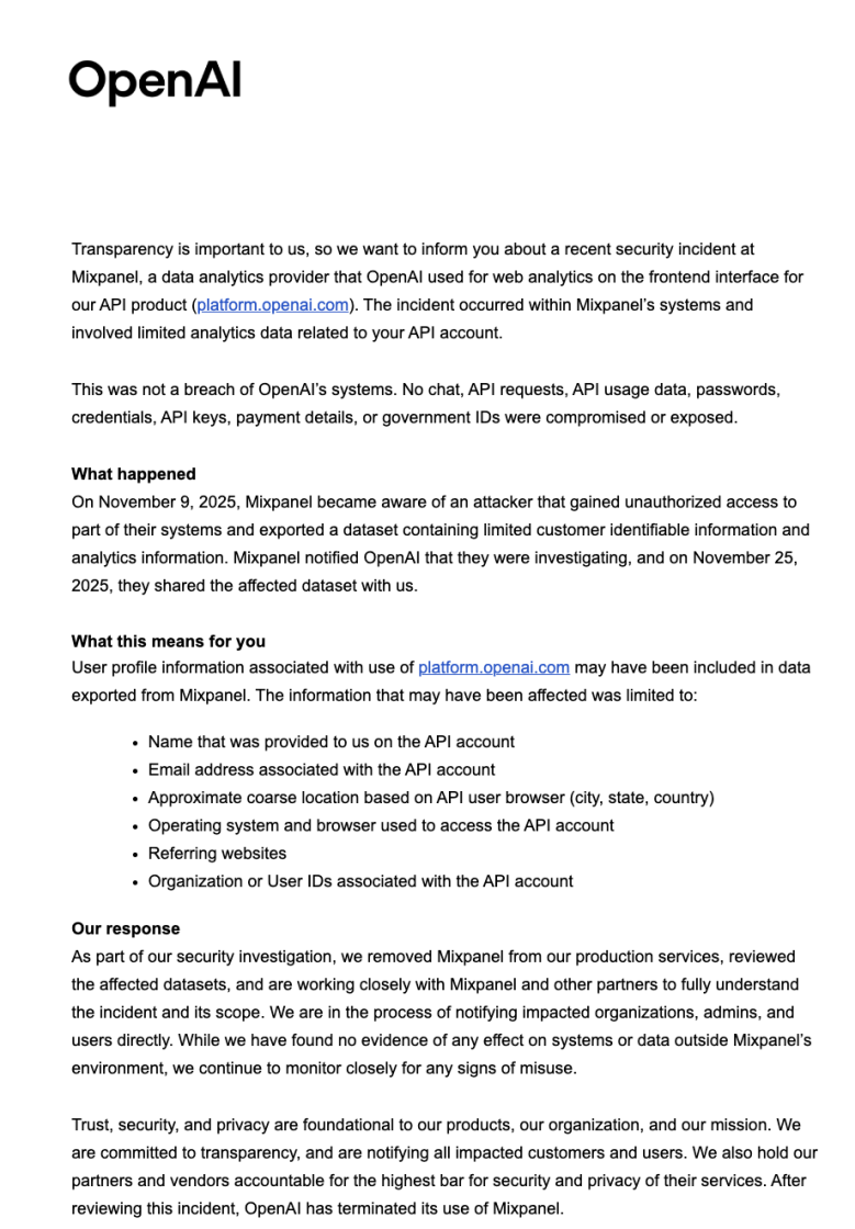 OpenAI в email повідомила про інцидент у Mixpanel — це американський сервіс вебаналітики, який компанія використовувала для збору технічної статистики на сайті платформи API. Йдеться про дані на кшталт браузера, міста підключення чи реферального джерела.