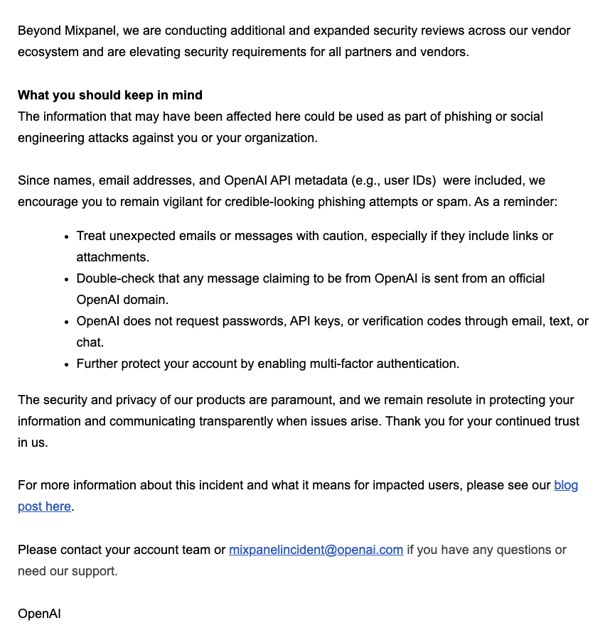 OpenAI підкреслює, що жодні чати, API-ключі, паролі, платежі чи дані запитів не постраждали. Після інциденту компанія повністю прибрала Mixpanel зі своїх продакшн-систем, перевірила отримані файли та почала індивідуально повідомляти тих, кого може стосуватися витік.