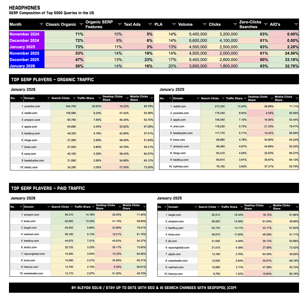 Аналітикиння Алейда Соліс проаналізувала склад сторінки результатів пошуку (SERP) і частку кліків у США, порівнявши січень 2025 та січень 2026 року в кількох вертикалях.