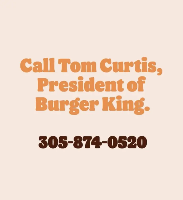 Burger King запустив нову ініціативу в Північній Америці: президент компанії в США та Канаді Том Кертіс публічно поділився своїм номером телефону для отримання відгуків від клієнтів. Люди можуть зателефонувати або надіслати повідомлення з будь-якими зауваженнями — без форм і служб підтримки.