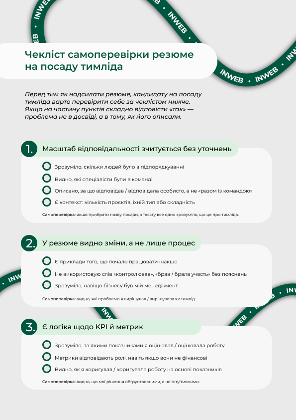 Перед тим як надсилати резюме, кандидату на посаду тимліда варто перевірити себе за чеклістом нижче. Якщо на частину пунктів складно відповісти «так» — проблема не в досвіді, а в тому, як він описаний.