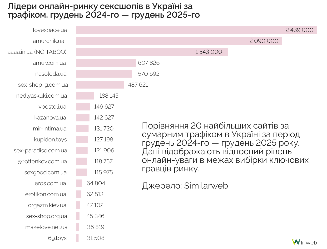 В Inweb проаналізували трафік провідних українських онлайн-сексшопів за даними Similarweb 2025 року. Лідери ринку формують основну частку онлайн-уваги, що свідчить про високу концентрацію трафіку та конкуренцію в органічному пошуку.