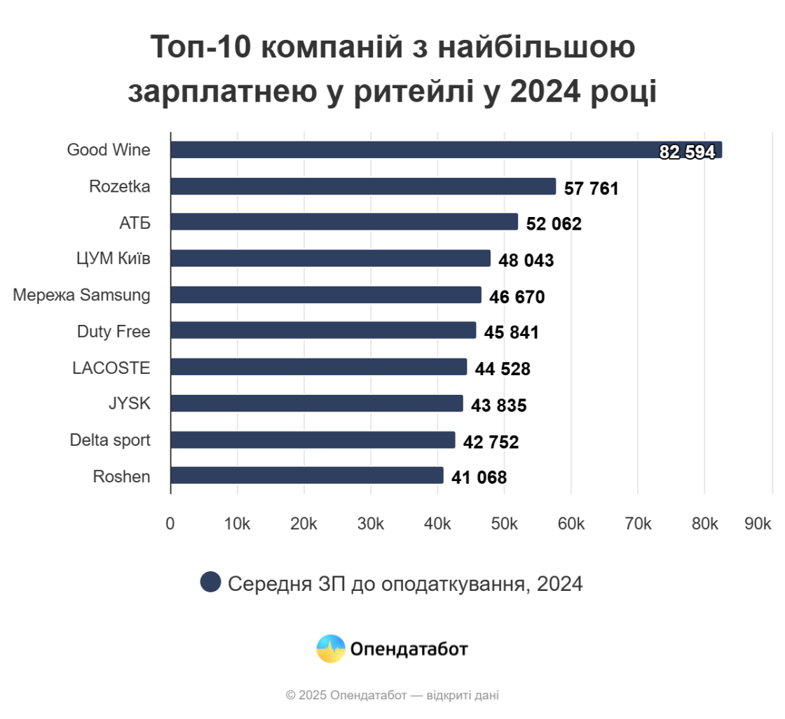Рівень оплати праці відрізняється між компаніями. Найвищу середню зарплату отримують співробітники мережі Бюро вин (GoodWine) — понад 82 тис. грн. У Розетці та АТБ-Маркеті вона становить від 52 до 57 тис. грн, тоді як у Форі та Новусі — близько 26 тис. грн на місяць.