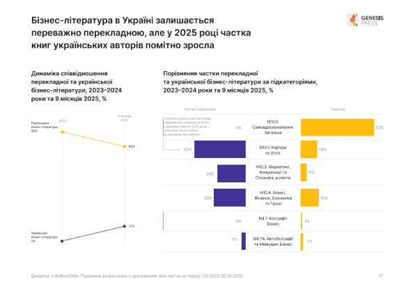 Дослідження також фіксує зміни у структурі ринку. Якщо у 2023 році частка українських авторів у бізнес-літературі становила лише 5%, то за дев’ять місяців 2025 року вона зросла до 17%, що свідчить про активніший розвиток локального авторства та запит на український контент.