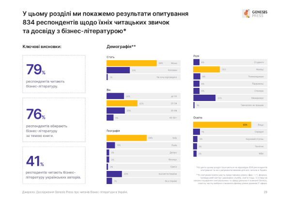 Окремий блок присвячений опитуванню українських читачів. У дослідженні взяли участь 834 респонденти. За результатами опитування, 79% учасників читають бізнес-літературу, а 76% обирають книги за тематикою. При цьому 41% читають роботи українських авторів.