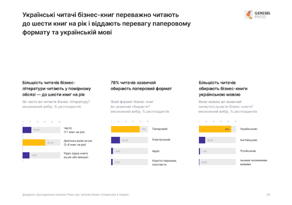 У звичках читання виділяються кілька тенденцій. Більшість аудиторії читає до шести книг на рік, а 78% стабільно віддають перевагу паперовому формату. Переважна частина респондентів обирає бізнес-книги українською мовою, що підтверджує зміщення попиту в бік локалізованого контенту.