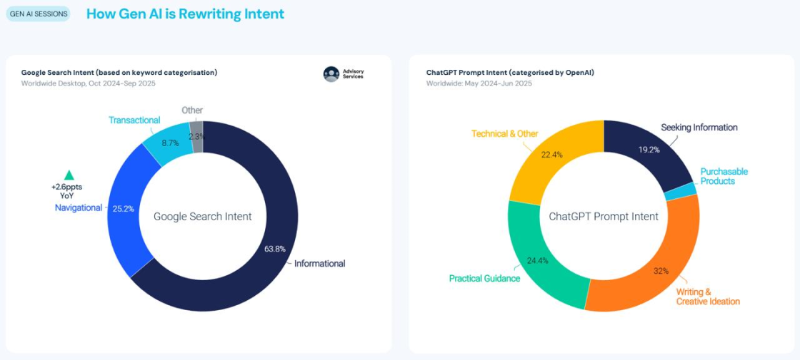 У Similarweb наголошують, що ШІ не замінює Google, а формує паралельну модель пошуку. Google залишається інструментом для швидких інформаційних і навігаційних запитів, тоді як ChatGPT частіше використовують для розв’язання задач у форматі діалогу. Це підтверджує структура намірів: у Google частка транзакційних запитів становить 8,7%, тоді як у ChatGPT — 2,1%, однак саме в ШІ користувачі формують рішення, навіть якщо покупка відбувається поза платформою.