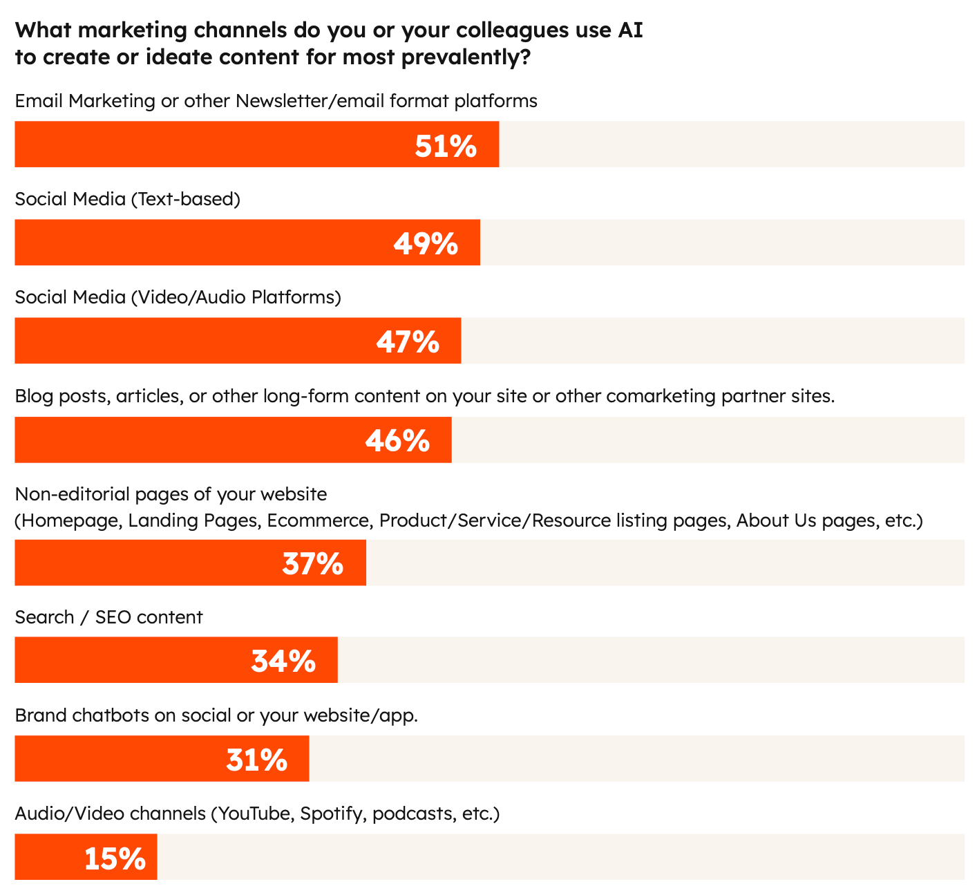 Найчастіше ШІ використовують для створення контенту (55%), досліджень (47%), автоматизації комунікацій (41%) та аналізу даних (36%). Лише 4% маркетологів покладаються на ШІ без редагування — більшість застосовує його як розумний прискорювач, а не заміну творчості.