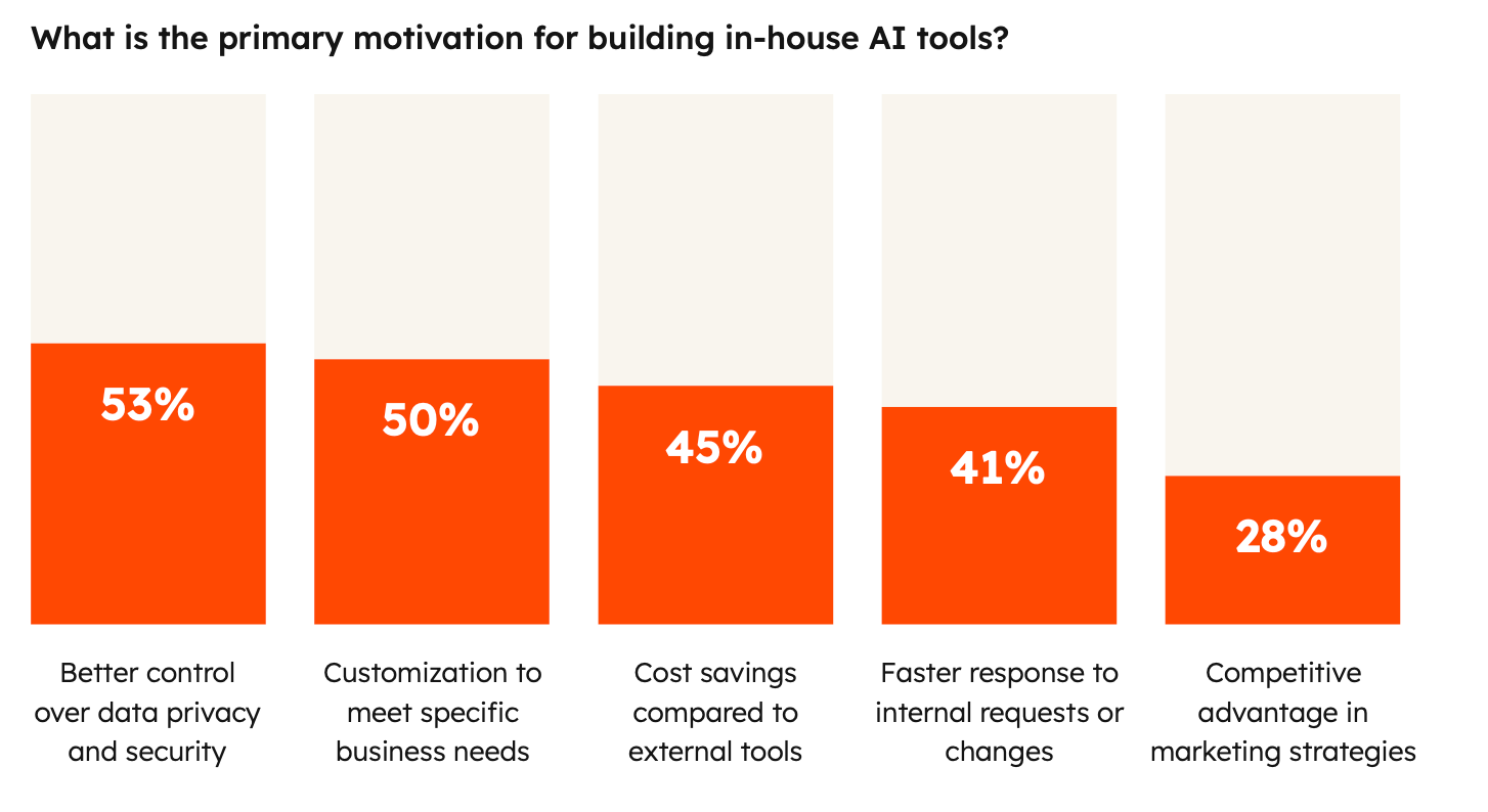 Такі внутрішні розробки не лише економлять ресурси, а й перевершують сторонні сервіси: 67% компаній визнали, що їхні власні системи працюють ефективніше. Основні мотиви — контроль даних (53%), кастомізація під бізнес-завдання (50%), економія коштів (45%) і швидкість реагування на зміни (41%).