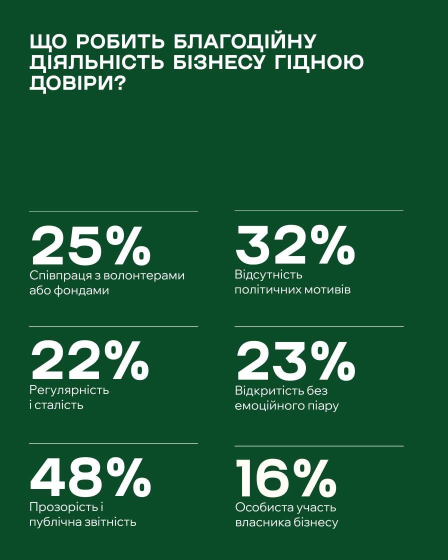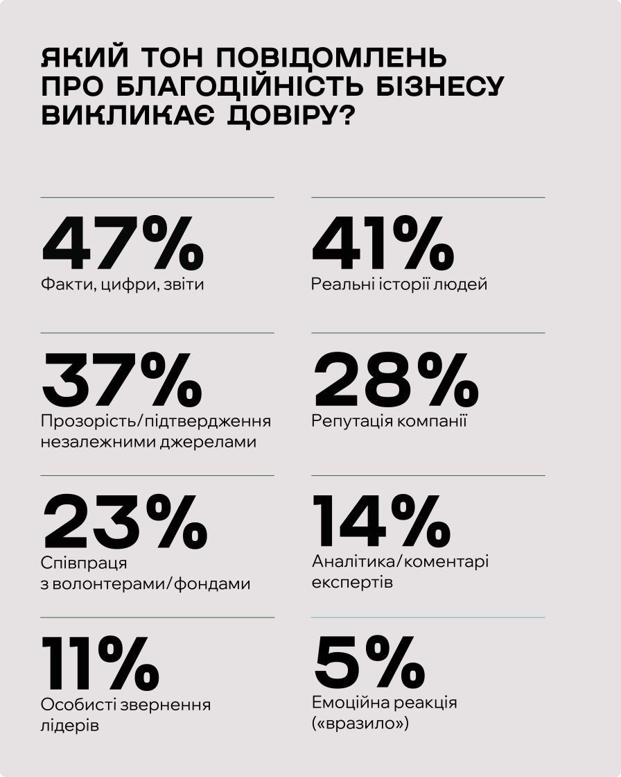 Найбільшу довіру викликає благодійність, підкріплена конкретними даними: 47% респондентів зазначили, що орієнтуються на факти і звітність. Для 41% важливими є реальні історії людей, а 37% очікують підтвердження з незалежних джерел. Звернення керівників компаній впливають на довіру лише для 11% опитаних.