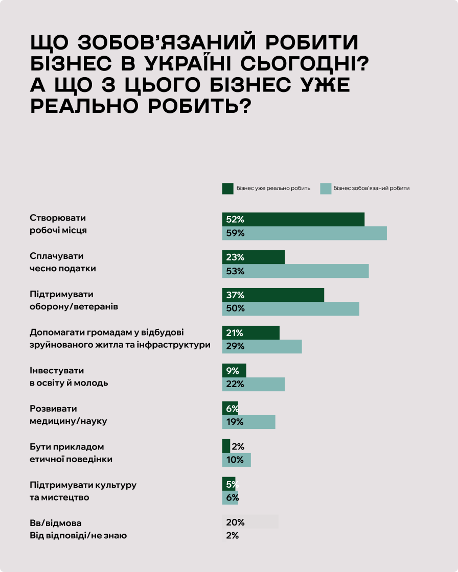 Водночас респонденти найчастіше помічають лише створення робочих місць, тоді як сплату податків рідко сприймають як виконання соціальної відповідальності.
