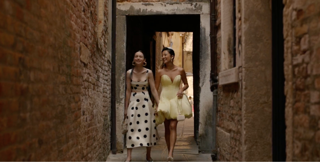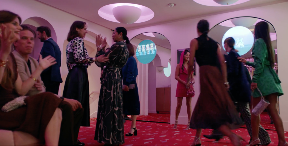 Рожева Rosalia Dress від Blazy Shower з’являється в сцені після виступу Мінді в паризькому кабаре Crazy Horse. Сукня працює як елемент сценічного образу та підсилює гламурну естетику епізоду.