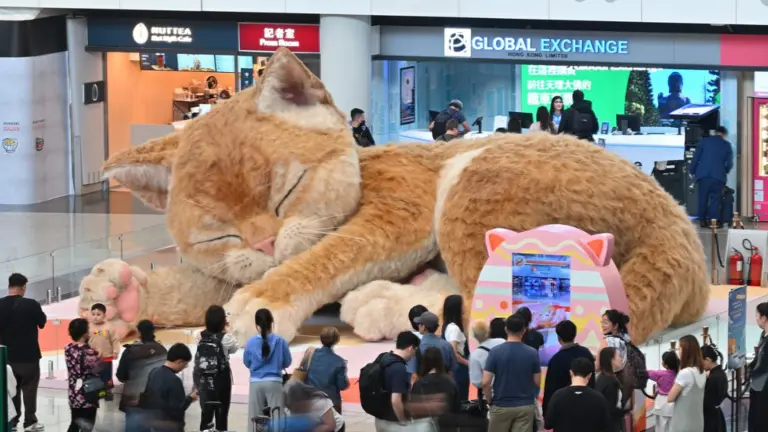 В міжнародному аеропорту Hong Kong International Airport з’явилась інтерактивна інсталяція у вигляді гігантського кота. Її встановили в зоні прильоту, щоб покращити досвід пасажирів після перельоту.