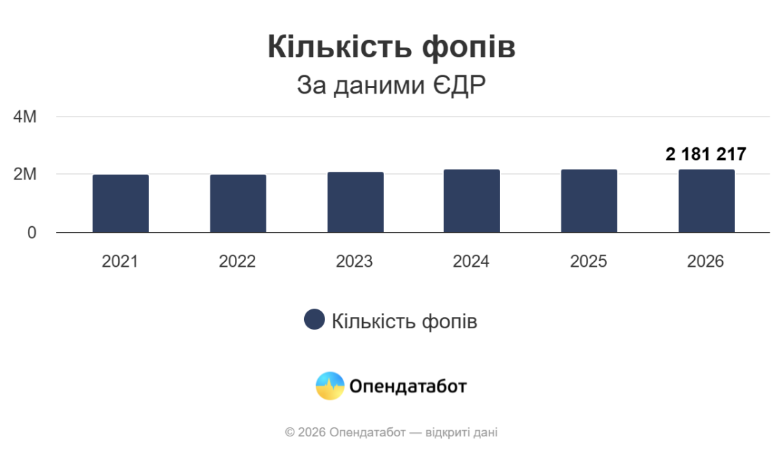 Згідно з оновленими даними, станом на початок 2026 року в Україні зареєстровано 2 181 217 ФОПів. Це на 6 тисяч більше, ніж наприкінці 2025 року. Порівняно з 2021 роком кількість фізичних осіб-підприємців зросла на 194 тисячі.