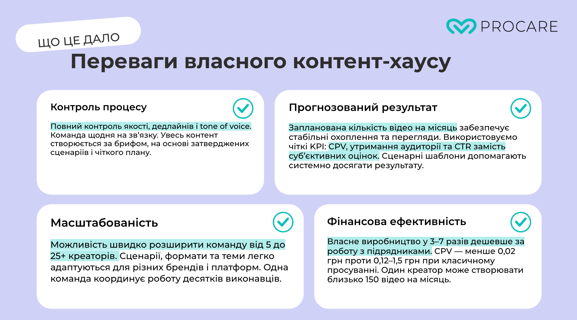 Друга — прогнозований результат. Якщо команда стабільно випускає 3 750 відео на місяць, то й охоплення можна планувати заздалегідь, а не вгадувати. Замість субʼєктивних оцінок («красиво — не красиво») команда ProCare працює з вимірюваними KPI: CPV, утримання аудиторії, CTR. Сценарні шаблони, які показали вірусний потенціал, тиражуються й дозволяють досягати результату системно, а не випадково.