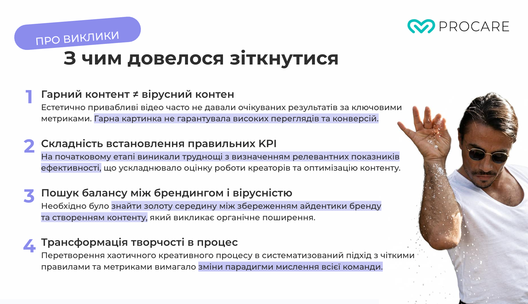 Пошук балансу між брендингом і вірусністю. Треба одночасно зберігати айдентику брендів ProCare (а їх 11 — зі своїми позиціонуваннями і аудиторіями) і провокувати органічне поширення. Надто брендовий контент не залітає, надто вірусний — розмиває впізнаваність. Цю межу команда шукала експериментально.