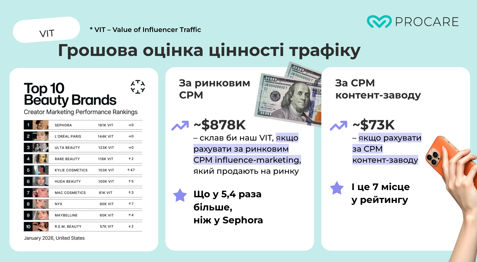 Якщо ж рахувати за внутрішнім CPM контент-заводу (тобто за реальною собівартістю виробництва всередині ProCare), VIT дорівнює приблизно $73K. З такими показниками український бренд посідав би сьоме місце в Top 10 Beauty Brands — поруч із MAC Cosmetics. І це без глобального ринку, без мільярдних бюджетів, без портфеля світових брендів у підпорядкуванні.