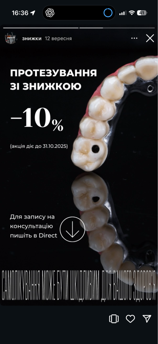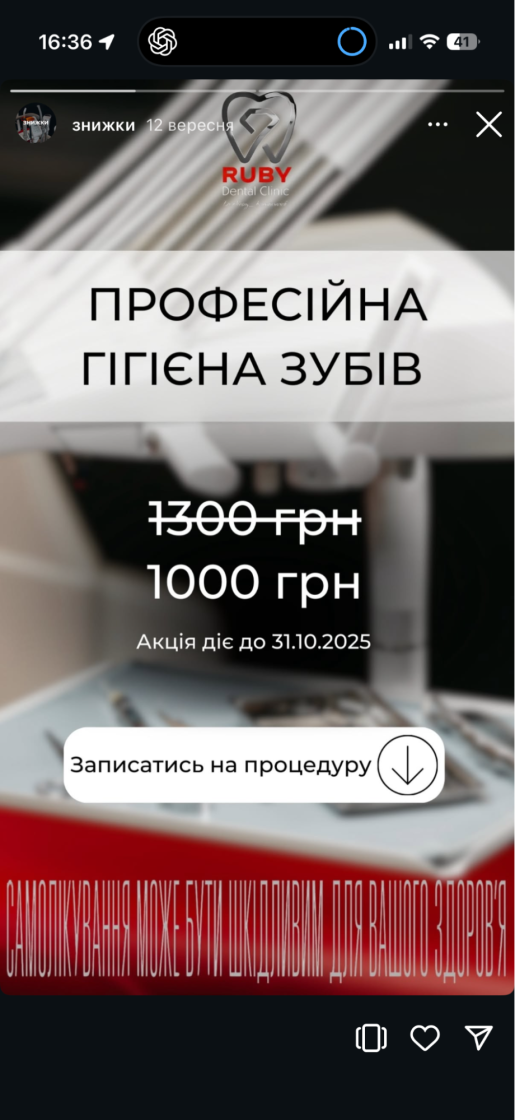 Найпоширеніший прийом — акції для перших візитів. Клініки можуть пропонувати безкоштовну консультацію, діагностику чи знижки на чистку. Рекламують це банерами на сайтах, постами у соцмережах та рекламою у Meta чи Google. Такий формат знижує психологічний бар’єр і спонукає зробити перший крок.