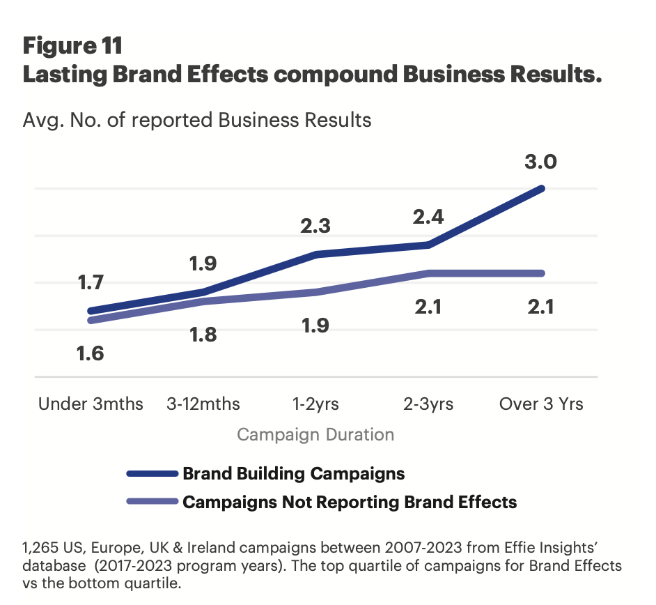 У даних Effie кампанії, які сильніше нарощують бренд-ефекти, з часом частіше звітують про більшу кількість бізнес-результатів. Це пояснює, чому бренд-білдінг у довшому горизонті частіше перетворюється на комерційні результати, ніж кампанії без виражених бренд-ефектів.