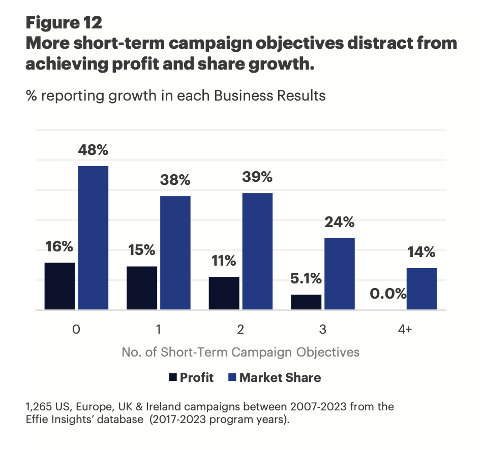 Effie фіксує ризик: чим більше кампанія переслідує короткострокові цілі, тим нижча ймовірність, що вона звітуватиме про зростання прибутку або частки ринку. У дослідженні це подають як системний виклик для маркетолога: short-term цілі легко обґрунтувати, але вони дроблять фокус і послаблюють те, що забезпечує довгий комерційний ефект — бренд-ефекти.