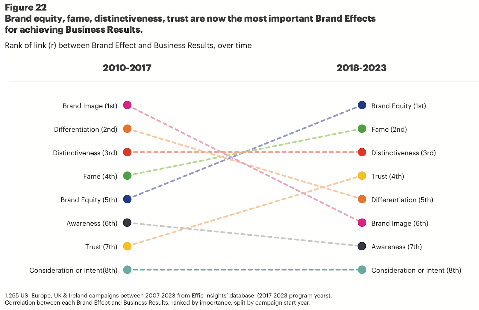 На цьому тлі в даних Effie зв’язок між бренд-ефектами і бізнес-результатами посилився з часом: те, що бренд уже встиг побудувати в пам’яті, сильніше впливає на здатність кампаній давати комерційний результат.