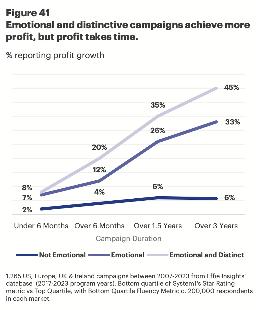 Окремий блок розділу — про те, що прибутковість частіше з’являється, коли кампанії охоплюють ширшу частину категорії та тривають достатньо довго, щоб сформувати пам’ять. Кампанії, які тривають понад рік, але мають вузький таргетинг і низьку позитивну емоцію, не повідомляють про інкрементальний прибуток.