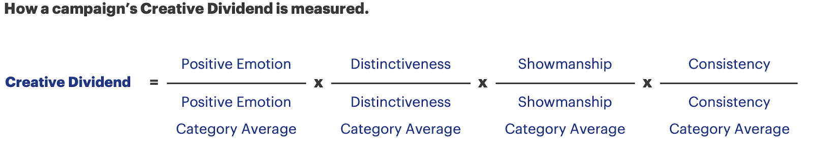 У дослідженні creative dividend формалізують мультиплікативно, через співвідношення кожного з чотирьох креативних чинників до середнього рівня по категорії. Автори також підкреслюють, що creative dividend — гнучкий інструмент: якщо немає даних по одному шару, його можна прибрати, але точність і практичність падають.